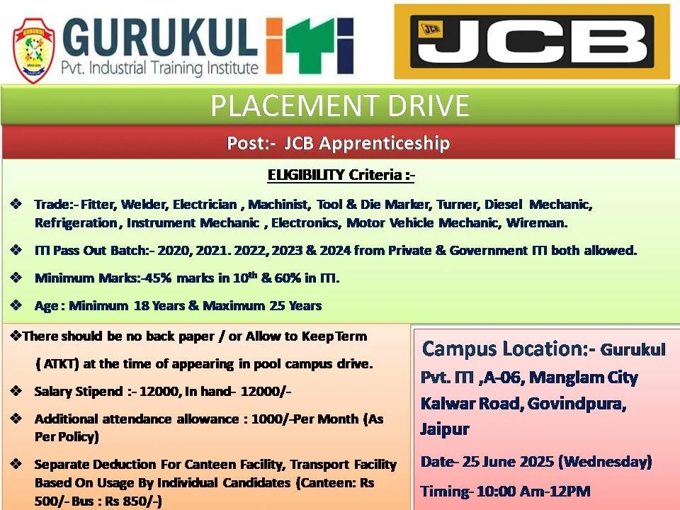 JCB ITI Campus Placement Recruitment 2025 Eligibility Criteria