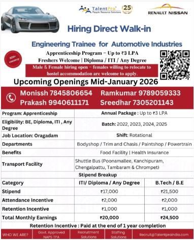 Renault Nissan Automotive Apprentice Recruitment 2025 Manufacturing Company Job Oragadam Chennai