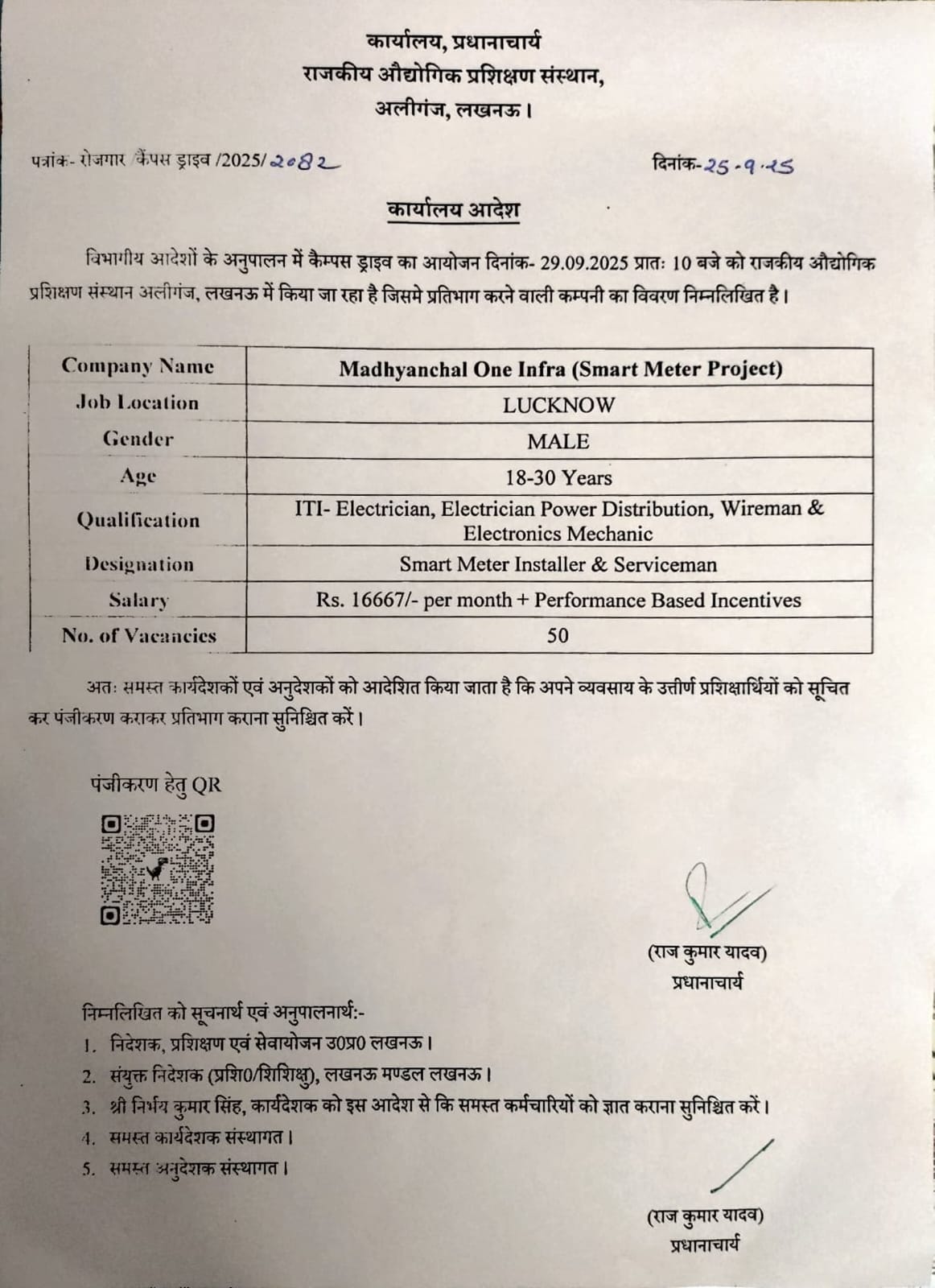 Job Opportunity: Smart Meter Installer & Serviceman at Madhyanchal One Infra (Smart Meter Project) Interested candidates are requested to apply through the provided QR code or official link before the deadline. For more details, refer to the official advertisement.